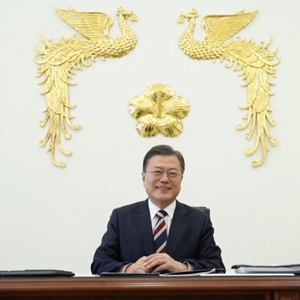 2月8日,韩国总统文在寅在首尔接受新华社等世界多家主要通讯社联合书面采访。新华社发(联合采访团供图)