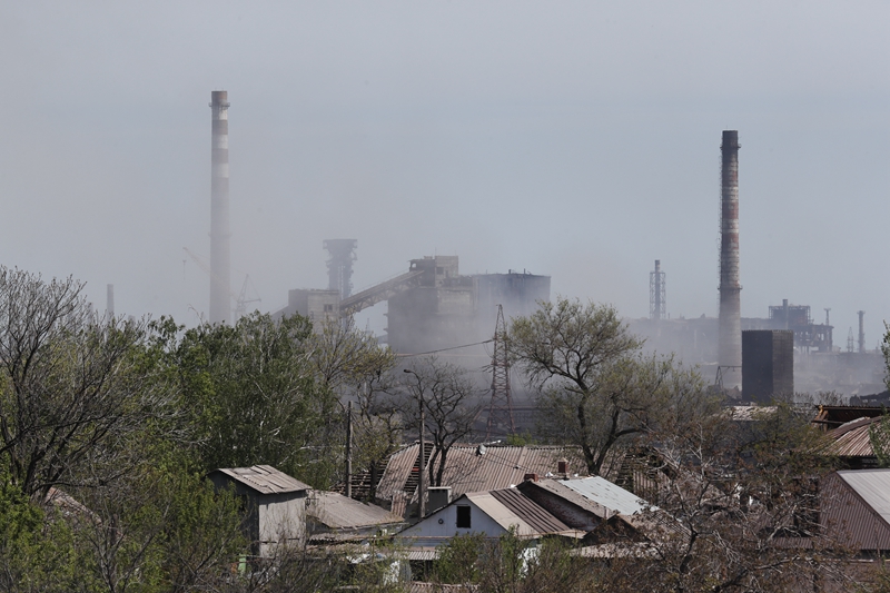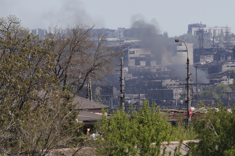 ↑5月8日,浓烟从马里乌波尔市亚速钢铁厂升起。新华社发(维克托摄)