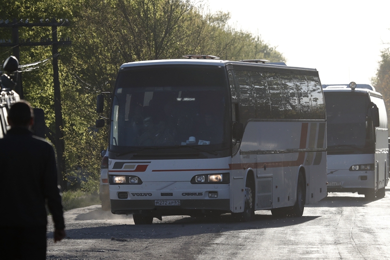 ↑5月7日,从马里乌波尔撤出的平民乘坐大巴抵达顿涅茨克别济缅内的安置点。新华社发(维克托摄)