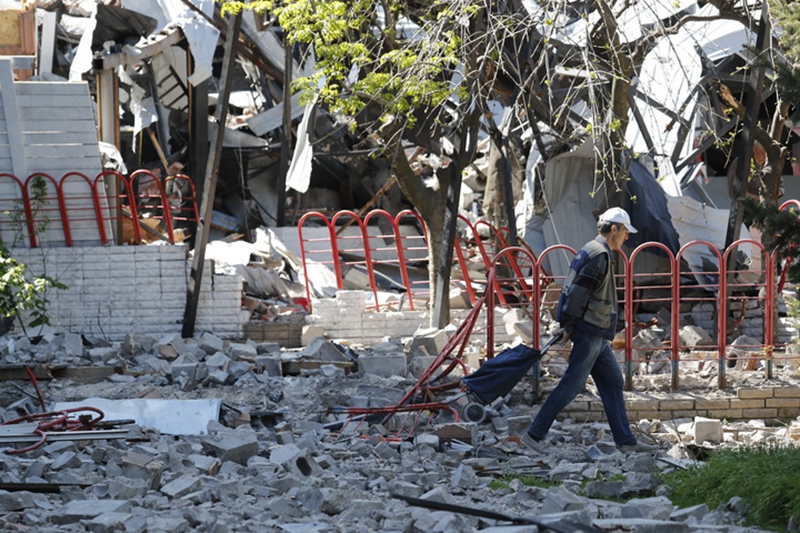↑5月8日,市民经过马里乌波尔街头的受损建筑。新华社发(维克托摄)