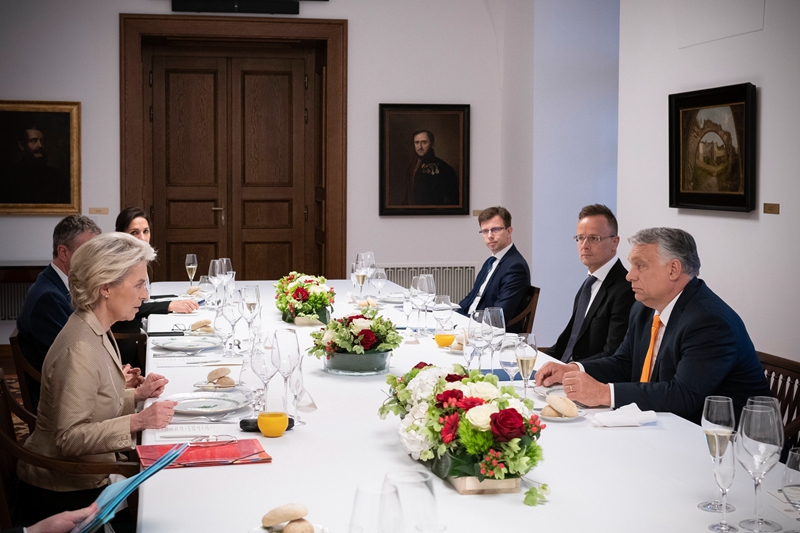 ↑5月9日,匈牙利总理欧尔班(右一)在布达佩斯与欧盟委员会主席冯德莱恩共进工作晚餐。匈牙利总理欧尔班9日在布达佩斯会见到访的欧盟委员会主席冯德莱恩,商讨欧盟对俄罗斯新一轮制裁问题。双方均表示会谈取得进展,但未达成协议。新华社发(匈牙利总理府供图/本科·薇薇安·谢尔摄)
