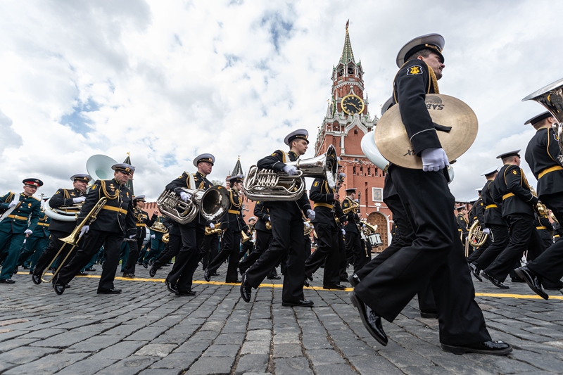 ↑这是5月9日在俄罗斯首都莫斯科拍摄的即将参加胜利日阅兵式的军乐团。俄罗斯9日在莫斯科红场举行阅兵式,纪念卫国战争胜利77周年。新华社记者 白雪骐 摄