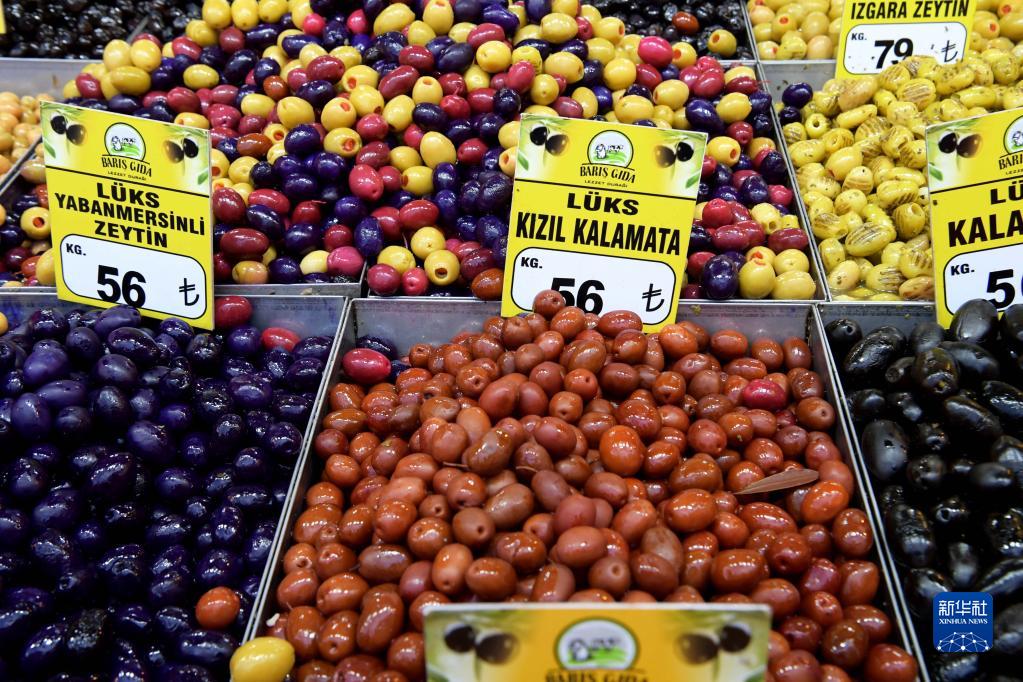 这是5月1日在土耳其伊斯坦布尔一处巴扎拍摄的食品。