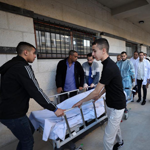 5月11日,在约旦河西岸杰宁的一家医院,记者和医务人员转移中弹身亡的女记者遗体。新华社发(艾曼·诺巴尼摄)