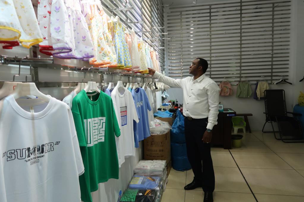 5月7日,来自喀麦隆的大卫正在“中国童装之都”看服装样品。新华社记者郑梦雨摄