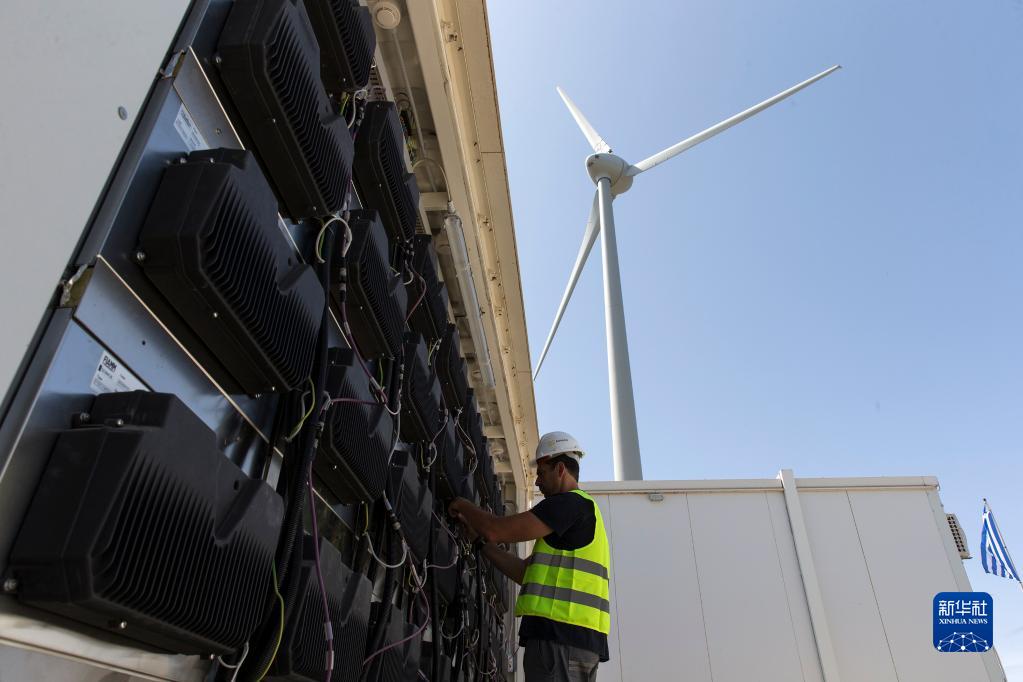 5月9日,在希腊蒂洛斯岛,一名工作人员在储存风能和太阳能的储能电池旁工作。