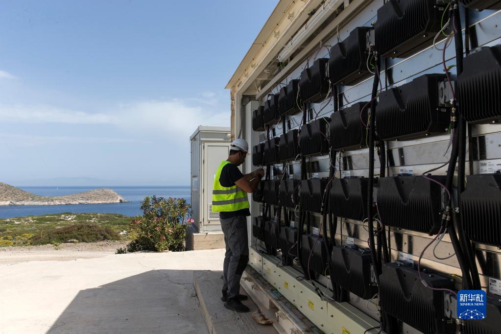 5月9日,在希腊蒂洛斯岛,一名工作人员在储存风能和太阳能的储能电池旁工作。
