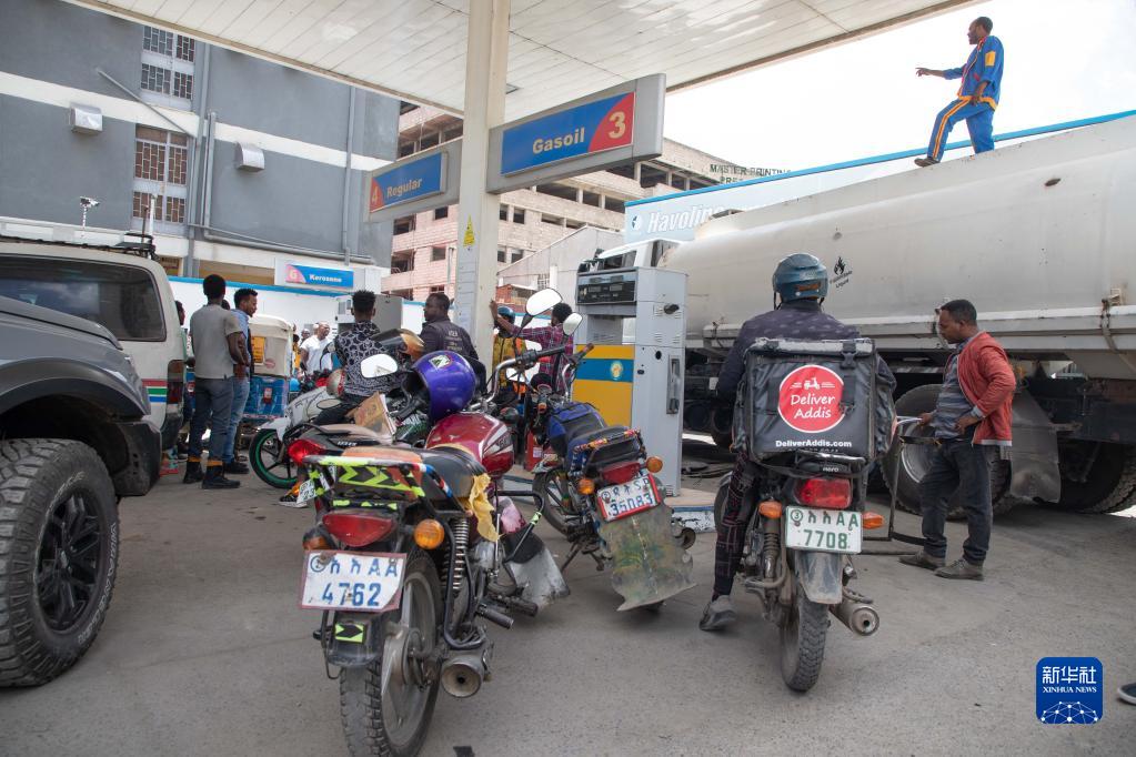 5月10日,摩托车在埃塞俄比亚首都亚的斯亚贝巴一座加油站排队加油。