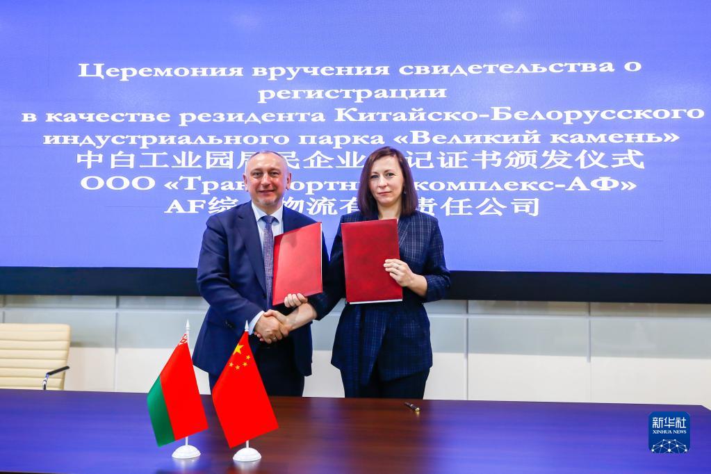 5月11日,在白俄罗斯明斯克,中白工业园管委会主任亚罗申科(左)向AF综合物流有限责任公司代表颁发入园证书。新华社发(中白工业园提供)