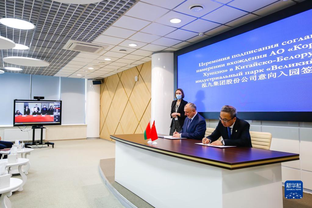 5月11日,在白俄罗斯明斯克,中白工业园代表与中国泓九集团股份公司进行意向入园签署协议线上签约。新华社发(中白工业园提供)
