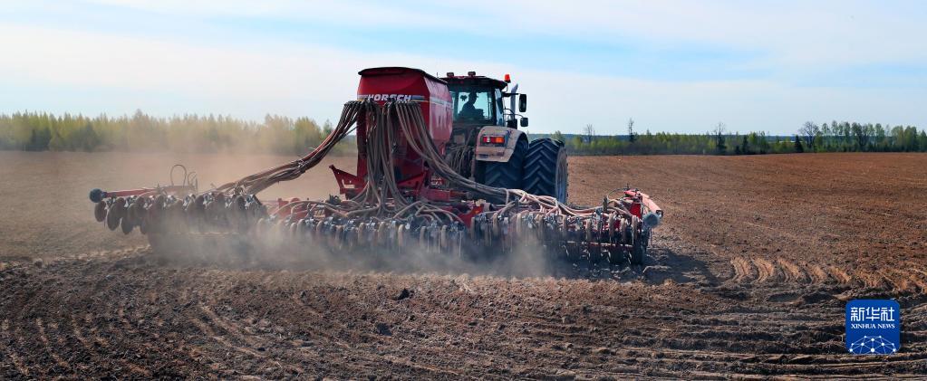 5月11日,农民操作农业机械在白俄罗斯明斯克州参与春耕。