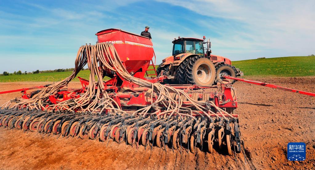 5月11日,农民操作农业机械在白俄罗斯明斯克州参与春耕。