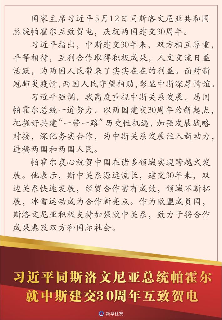 新华社北京5月12日电 国家主席习近平5月12日同斯洛文尼亚共和国总统帕霍尔互致贺电,庆祝两国建交30周年。