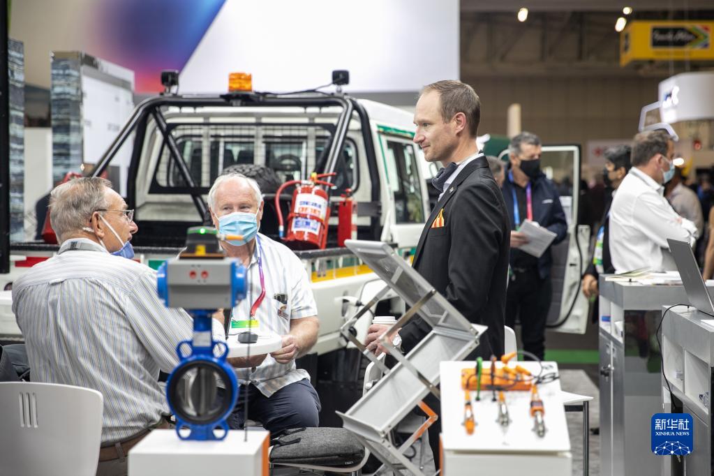 5月9日,在南非立法首都开普敦,人们在非洲大型矿业投资会议的展台交谈。