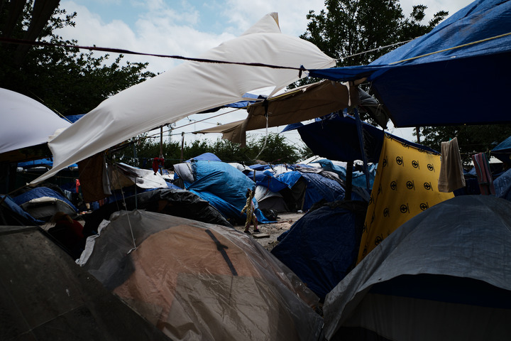 5月2日,在墨西哥雷诺萨一处移民聚集点,一名女童走过聚集点内临时搭建的帐篷。新华社记者辛悦卫摄