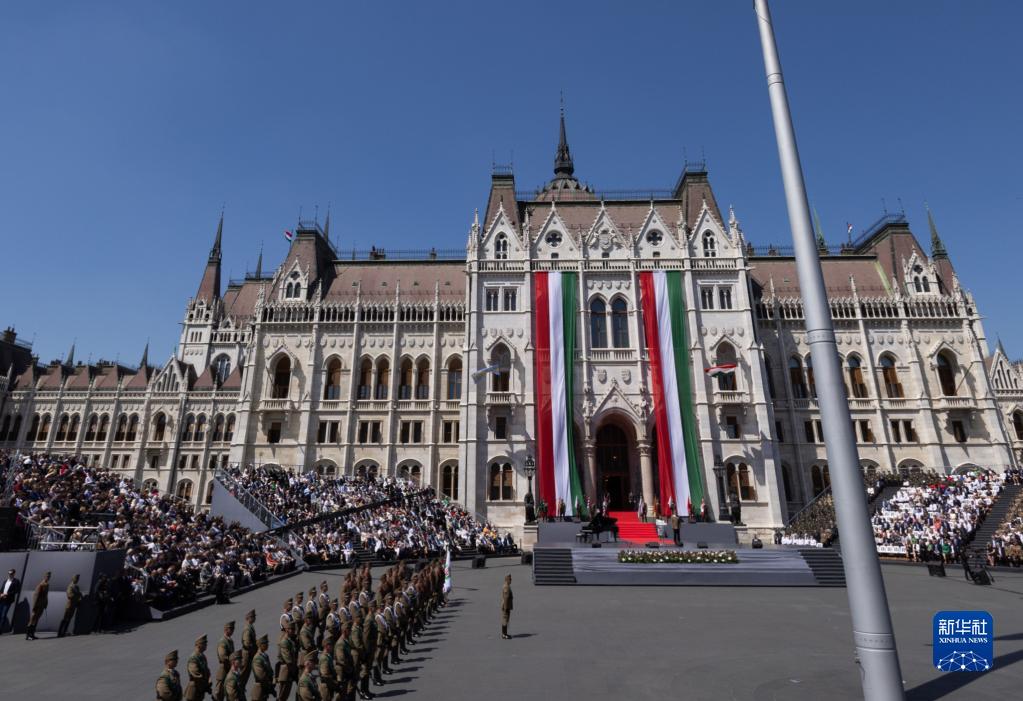 这是5月14日在匈牙利布达佩斯国会大厦前拍摄的总统诺瓦克·卡塔琳就职典礼现场。