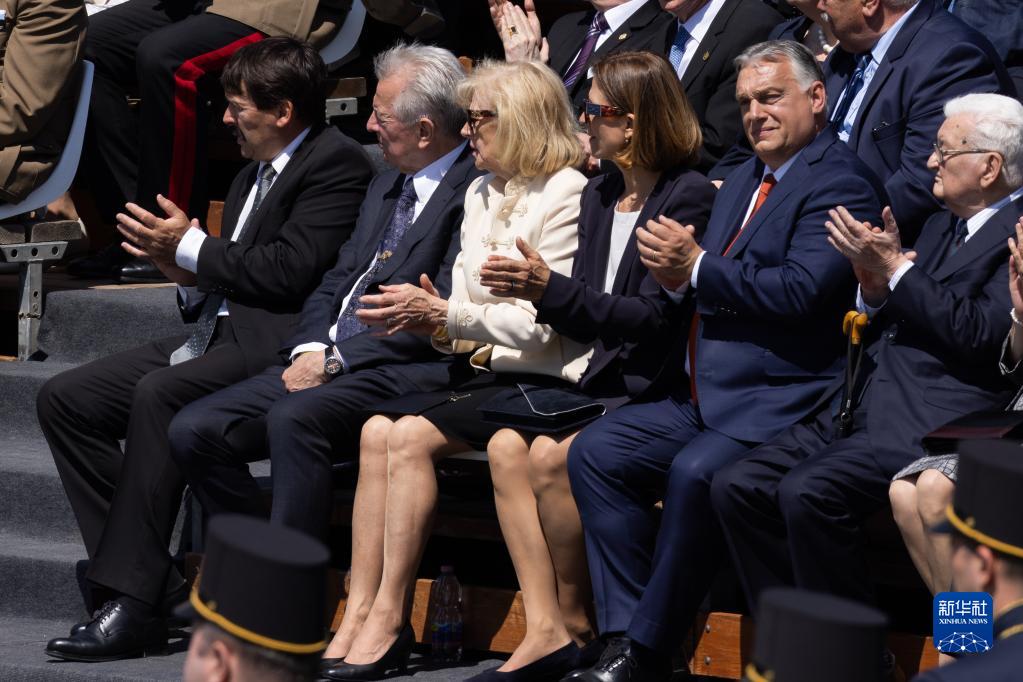 5月14日,在匈牙利布达佩斯国会大厦前,总理欧尔班(右二)出席总统诺瓦克·卡塔琳的就职典礼。