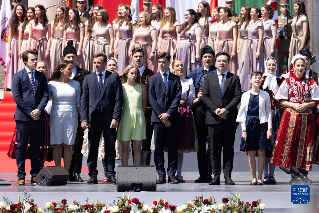 5月14日,在匈牙利布达佩斯国会大厦前,匈牙利总统诺瓦克·卡塔琳(前排左二)与家人和演员在就职典礼上唱歌。