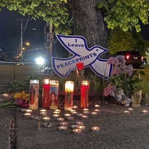 5月15日凌晨,人们在美国纽约州布法罗市的枪击案现场附近摆放蜡烛纪念遇难者。新华社发(张杰摄)