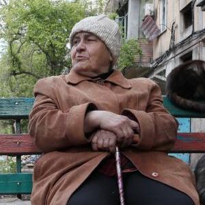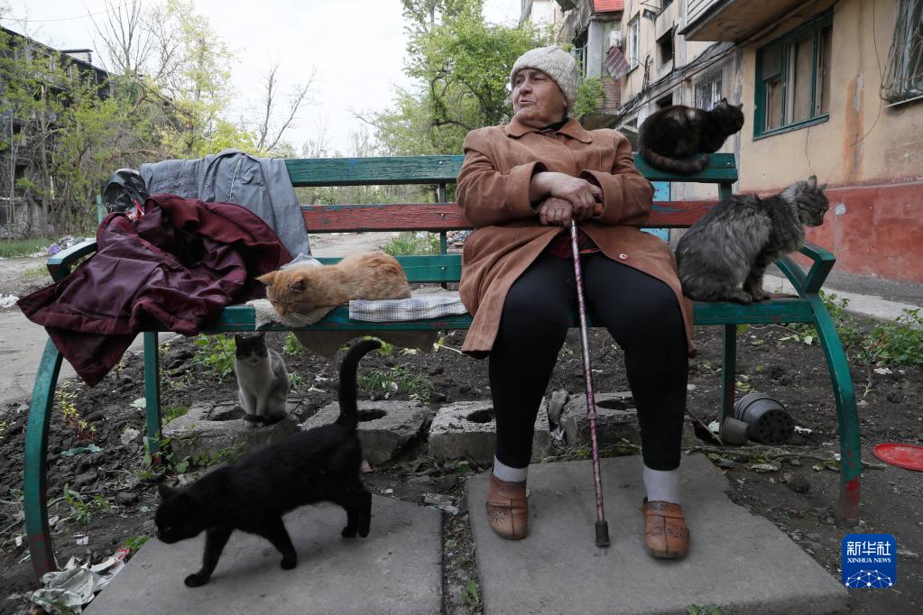 5月15日,在马里乌波尔,一位当地居民坐在室外休息。