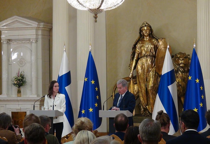 5月15日,在芬兰赫尔辛基,芬兰总统尼尼斯托(右)和总理马林参加联合记者会。新华社记者陈静摄