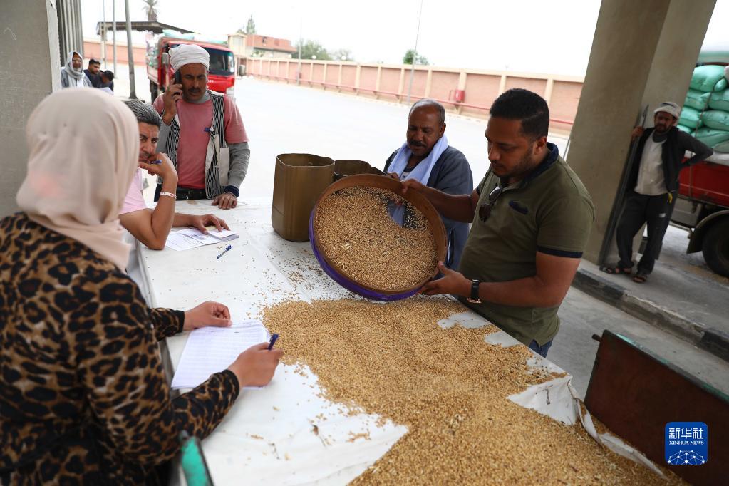 5月16日,在埃及本哈,收购小麦的人员检查小麦质量。