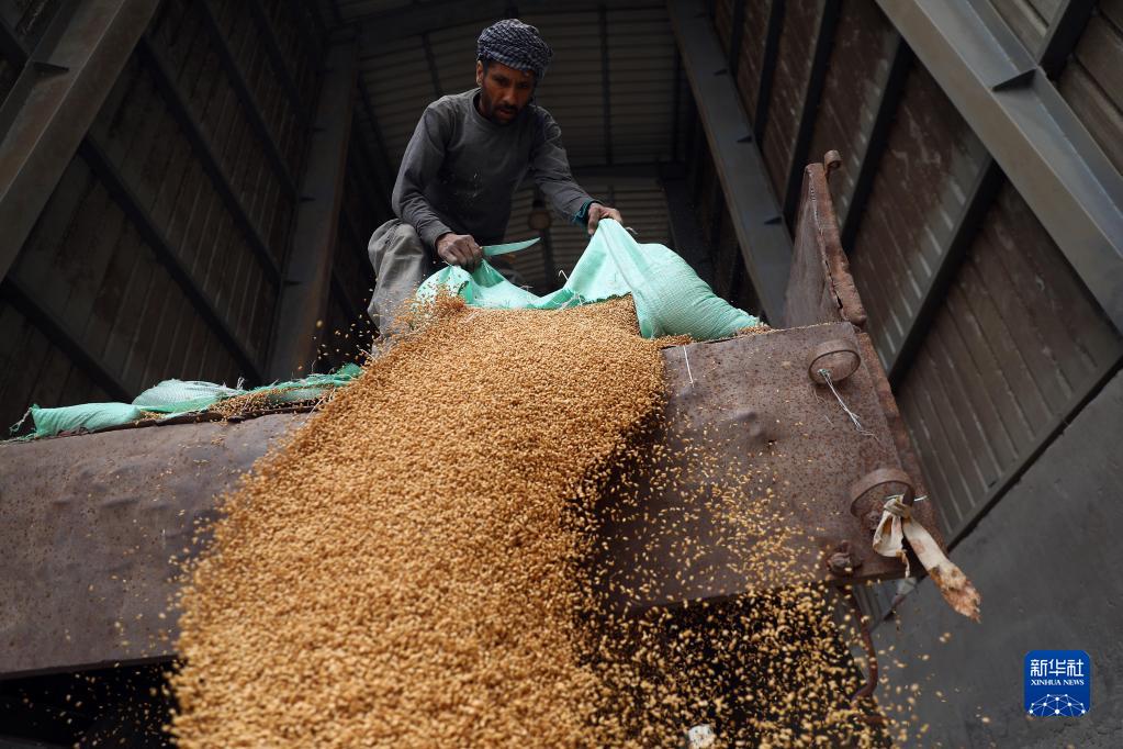 5月16日,在埃及本哈一处粮仓,工人从车上卸下小麦。