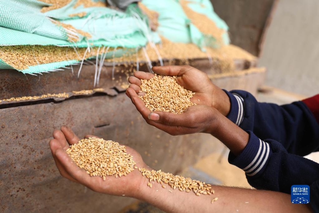 5月16日,埃及本哈一处粮仓的工作人员手捧小麦。