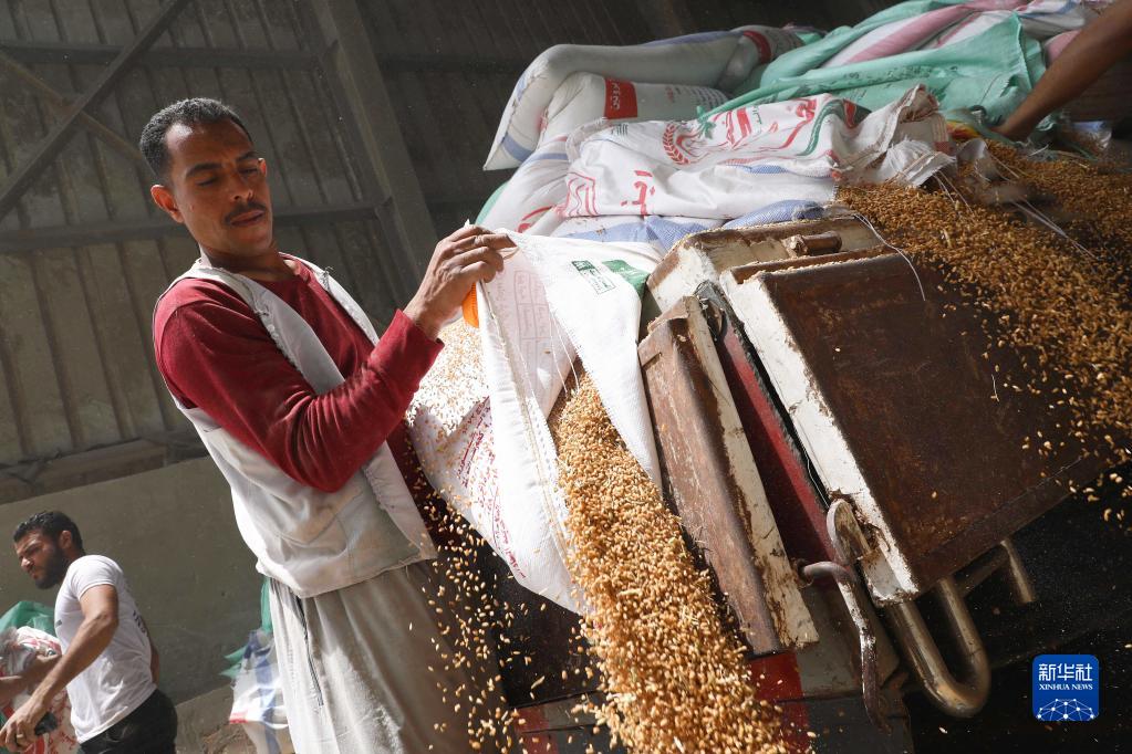 5月16日,在埃及本哈一处粮仓,工人从车上卸下小麦。