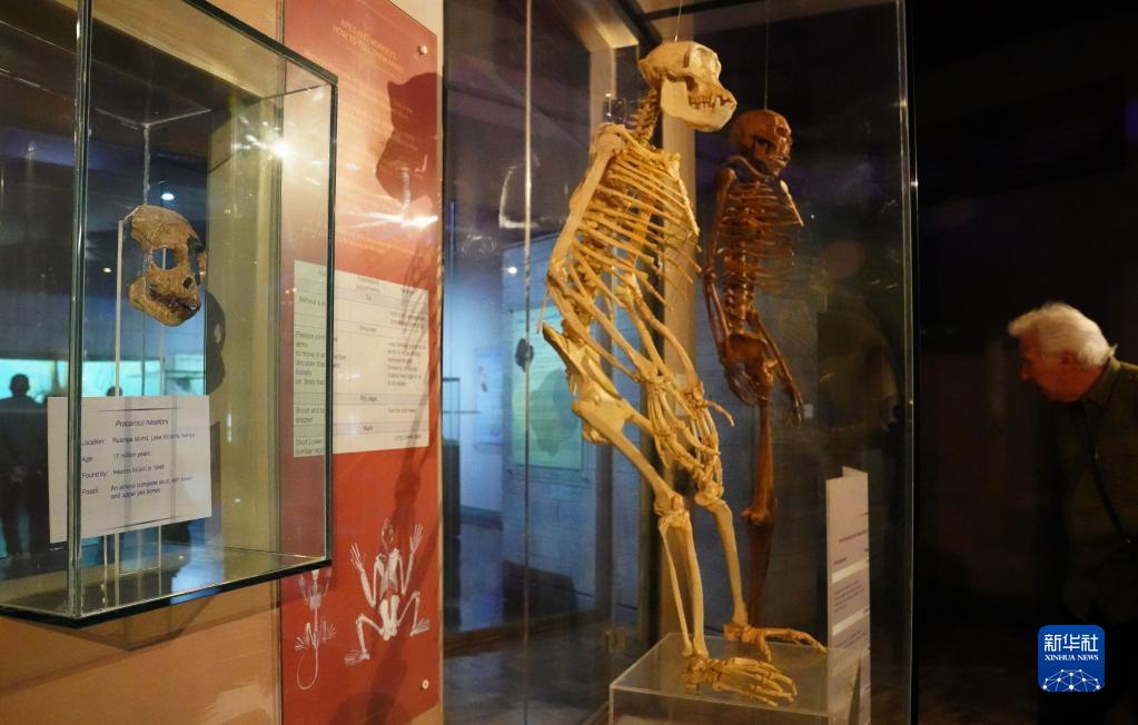 这是5月16日在内罗毕国家博物馆拍摄的1700万年前的猿头骨(左)等展品。