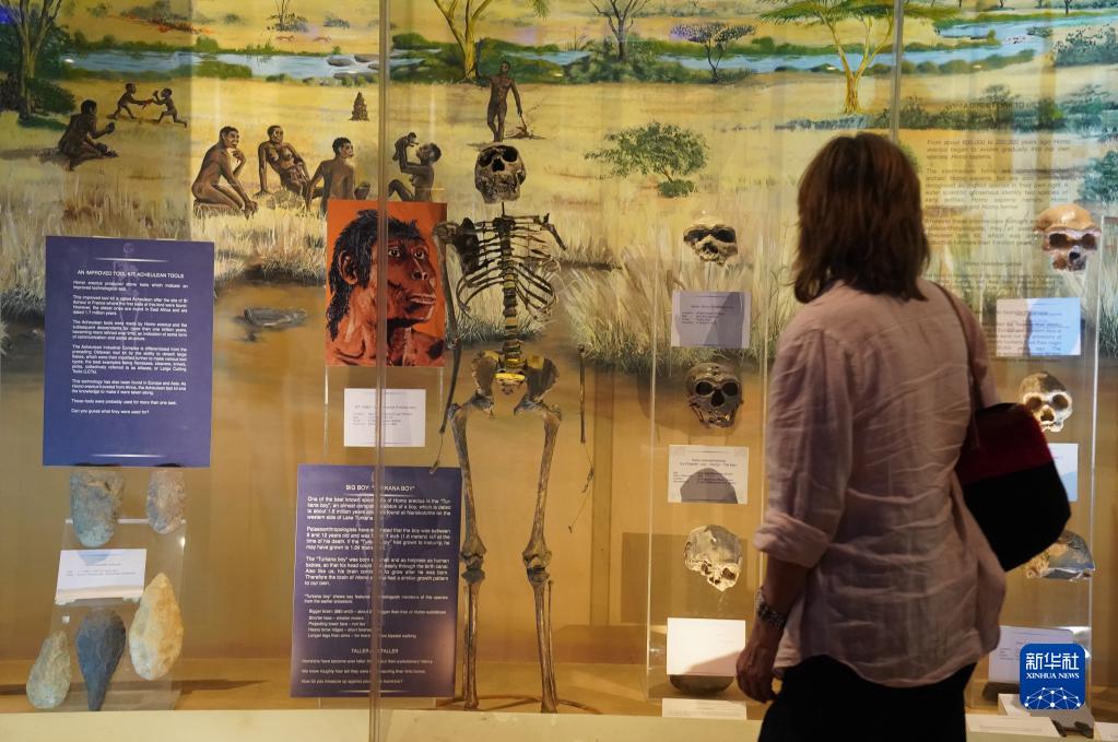 这是5月16日在内罗毕国家博物馆拍摄的“镇馆之宝”——“图尔卡纳男孩”(中)。“图尔卡纳男孩”骨骼化石于1984年在肯尼亚北部图尔卡纳湖西岸被发现。除了脚部和某些部位缺失,这具距今约160万年的化石堪称史前人类最完整的骨架。