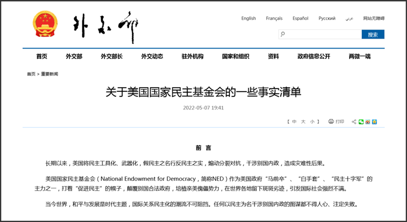 2022年5月7日,外交部网站发布《关于美国国家民主基金会的一些事实清单》,这份约12000字的材料通过数百条从公开报道中搜集的具体事例,将美国国家民主基金会的真实面目充分暴露在世人面前。