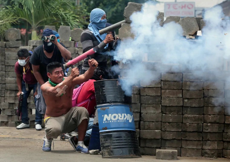 2018年6月,在尼加拉瓜的马萨亚市,抗议者使用自制武器与警方发生冲突。