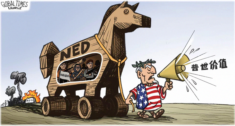 长期以来,美国将所谓普世价值工具化、武器化,煽动分裂对抗,干涉别国内政,造成灾难性后果。NED就是美国政府祸乱别国的“特洛伊木马”。(漫画 | 刘蕊)