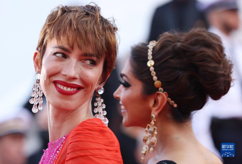 5月17日,在法国南部海滨小城戛纳,主竞赛单元评委、英国演员丽贝卡·豪尔(左)与印度演员迪皮卡·帕杜科内踏上第75届戛纳国际电影节开幕式红毯。