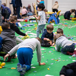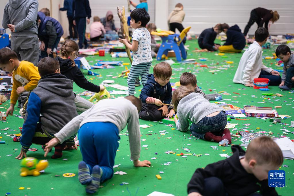 3月8日,乌克兰儿童在波兰华沙国际会展中心玩耍。新华社发(华沙PTAK国际会展中心供图)