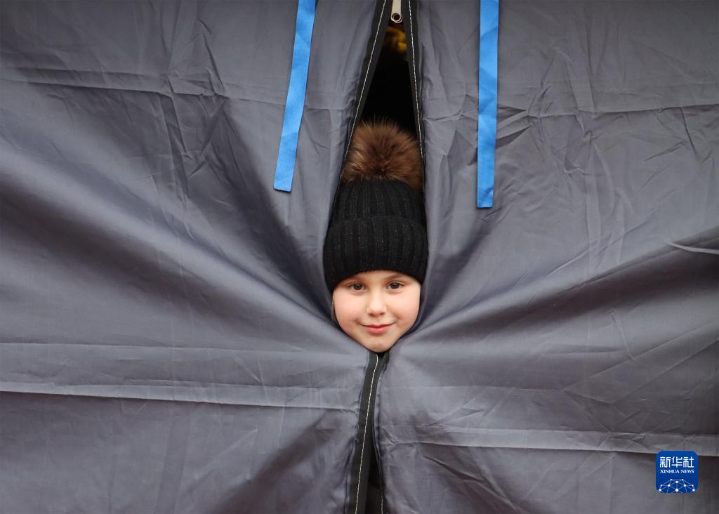 2月27日,在罗马尼亚北部与乌克兰接壤的锡雷特边境关口,一名小男孩把头探出帐篷外。新华社记者 林惠芬 摄