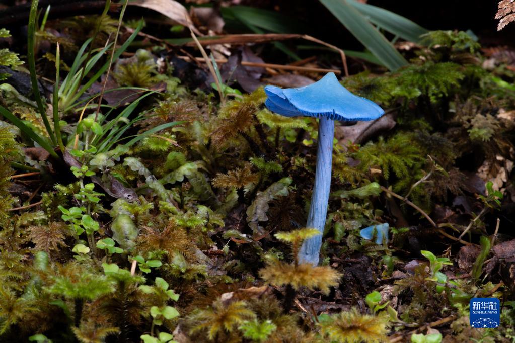 这是5月5日在新西兰南岛西海岸福克斯温带雨林中拍摄的蓝色霍氏粉褶菌。霍氏粉褶菌是新西兰的代表性本土菌种。其菌盖呈锥型,主要生长在阔叶林和针叶林的罗汉松与山毛榉树下。由于其独特性,霍氏粉褶菌的画面被印在了新西兰50元纸币上。