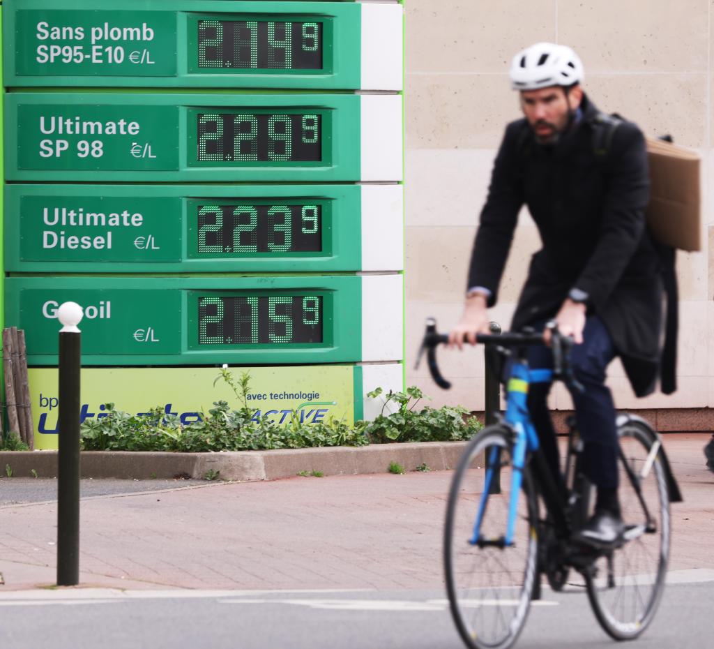 一名男子骑车经过法国巴黎一处加油站。新华社记者高静摄