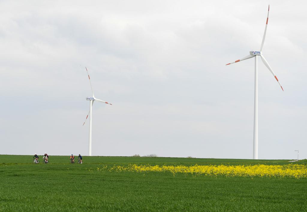 人们骑自行车从德国法兰克福郊外的一处风电机组前经过。新华社记者 逯阳 摄