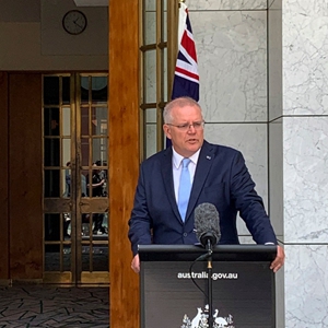 2021年1月8日,澳大利亚总理莫里森在堪培拉出席新闻发布会(手机拍摄)。新华社记者岳东兴摄
