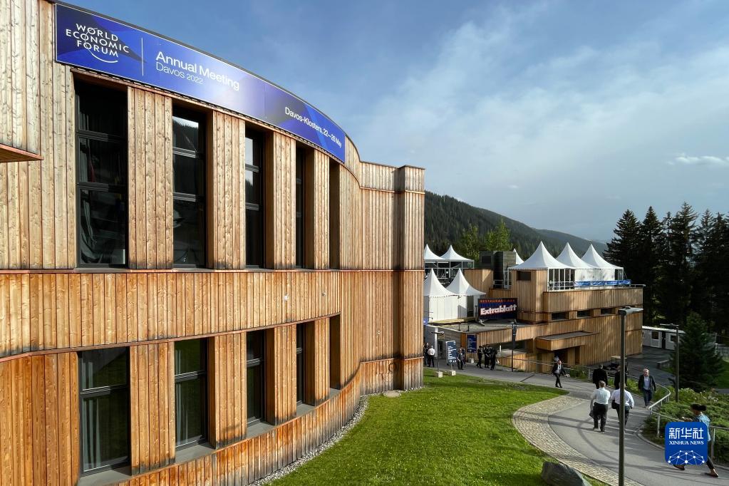 5月22日,人们走在瑞士达沃斯世界经济论坛年会会议中心外。