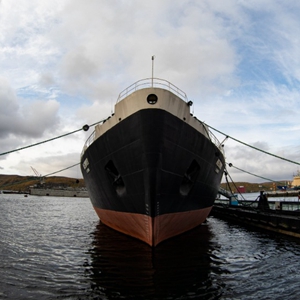 2019年9月14日在俄罗斯摩尔曼斯克拍摄的核动力破冰船“列宁”号。摩尔曼斯克市临巴伦支海的科拉湾,深入北极圈以内300公里,是北极圈内最大城市。新华社记者白雪骐摄