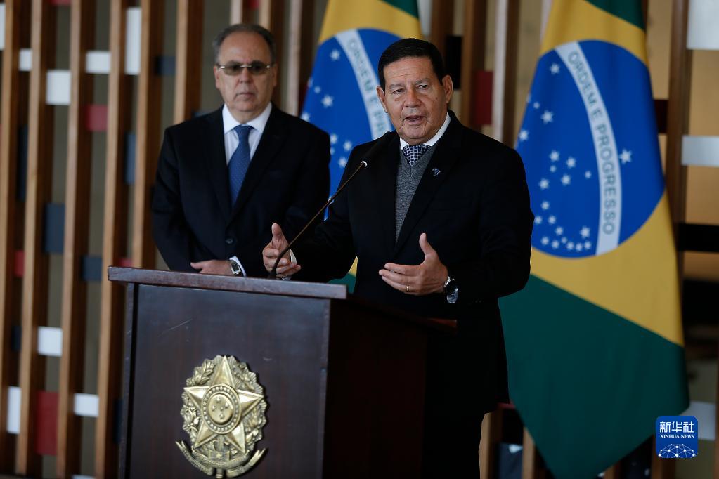 5月23日,在巴西首都巴西利亚伊塔马拉蒂宫,巴西副总统莫朗在巴中高层协调与合作委员会第六次会议后召开的新闻发布会上讲话。