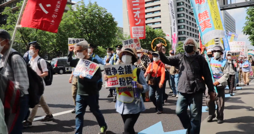 5月23日,民众在日本东京街头举行抗议集会。(视频截图)