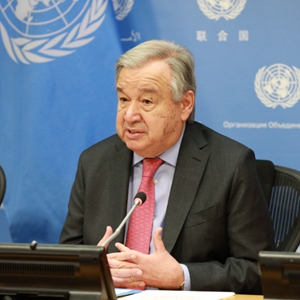 4月13日,在位于纽约的联合国总部,联合国秘书长古特雷斯在全球粮食、能源和金融危机应对小组针对乌克兰冲突发布政策简报的记者会上讲话。新华社记者谢锷摄