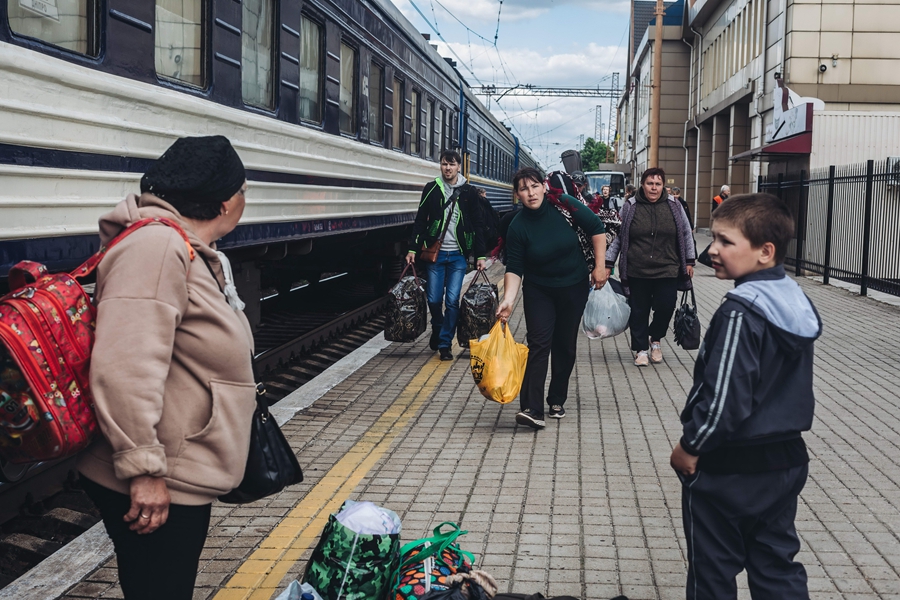 ↑5月23日,在顿涅茨克的波克罗夫斯克,人们准备登上火车。新华社发(迭戈·埃雷拉摄)