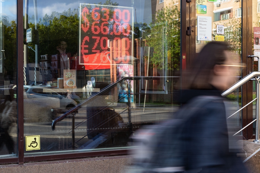 ↑5月24日,在俄罗斯首都莫斯科,行人经过一家外汇兑换点。俄罗斯财政部网站23日发布消息说,将俄罗斯出口所得外汇收入强制结汇为卢布的比例从80%下调至50%。新华社记者白雪骐摄