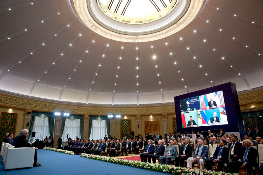 ↑这是5月26日拍摄的欧亚经济联盟首届欧亚经济论坛现场。欧亚经济联盟首届欧亚经济论坛26日在吉尔吉斯斯坦首都比什凯克举行,各方围绕交通和能源基础设施、金融政策、产业合作、电子商务等领域的议题展开讨论。此次论坛主题为“全球变化时代下的欧亚经济一体化和投资新机遇”。论坛为期一天,与会经济界和政府代表超过2500人。新华社发(罗曼摄)