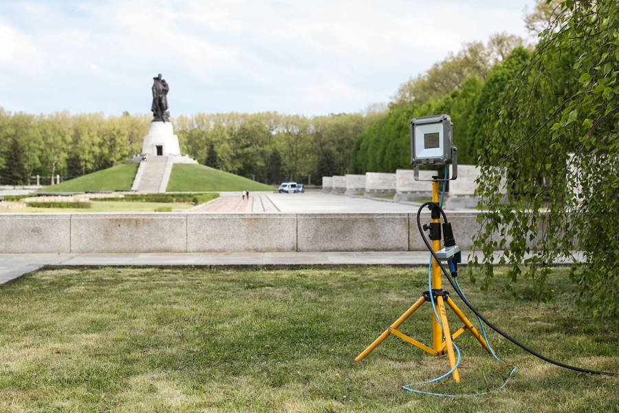 ↑这是5月5日在德国首都柏林特雷普托公园内的苏军烈士陵园拍摄的为加强夜间保护安装的探照灯。特雷普托公园内坐落着德国境内最大的苏军烈士陵园,建成于1949年,用于纪念在二战柏林战役中牺牲的苏联军人。今年4月,陵园里的纪念碑两次被涂上辱骂性标语。此后,陵园外安置了警用护栏,多辆警车在园内驻守、巡逻,纪念碑四周也新装了多盏探照灯。新华社记者 单宇琦 摄